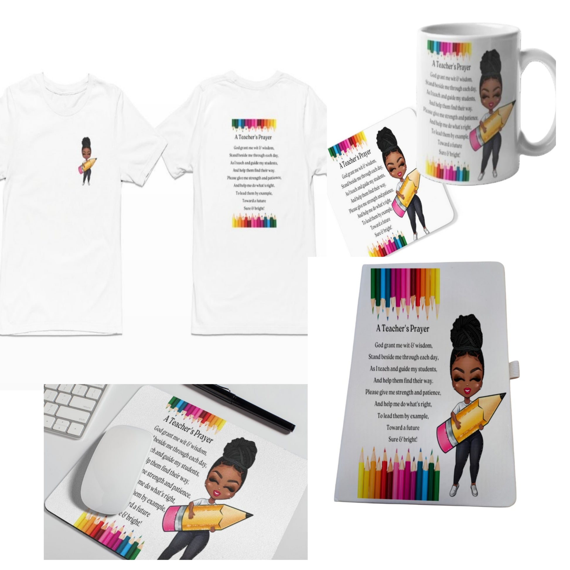 Celebrate an amazingly dedicated teacher with this thoughtful gift set designed to inspire and appreciate. It features a 160-page faux leather journal with a convenient pen holder for notes and reflections, a durable 11oz coffee mug showcasing the meaningful design, and a matching waterproof polyester coaster to protect surfaces. The set also includes a comfortable cotton/polyester blend t-shirt with a classic fit and a practical mousepad, making it a perfect combination of style and function. Show your gratitude with a personalized gift that supports their passion every day.